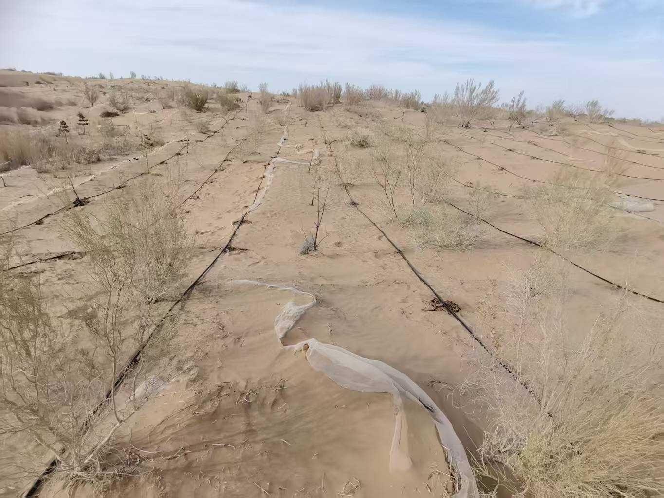 “为提升植物多样性与防护效能,项目在沿用梭梭等3种常用树种基础上,引进了榆树、紫穗槐、四翅滨藜等10个新种”李锦荣介绍,现已完成多树种优化配置示范林50亩,以及结合低立式沙障的复合固沙带2000亩,有效改善了种质资源偏少、富户体系单一的局面。