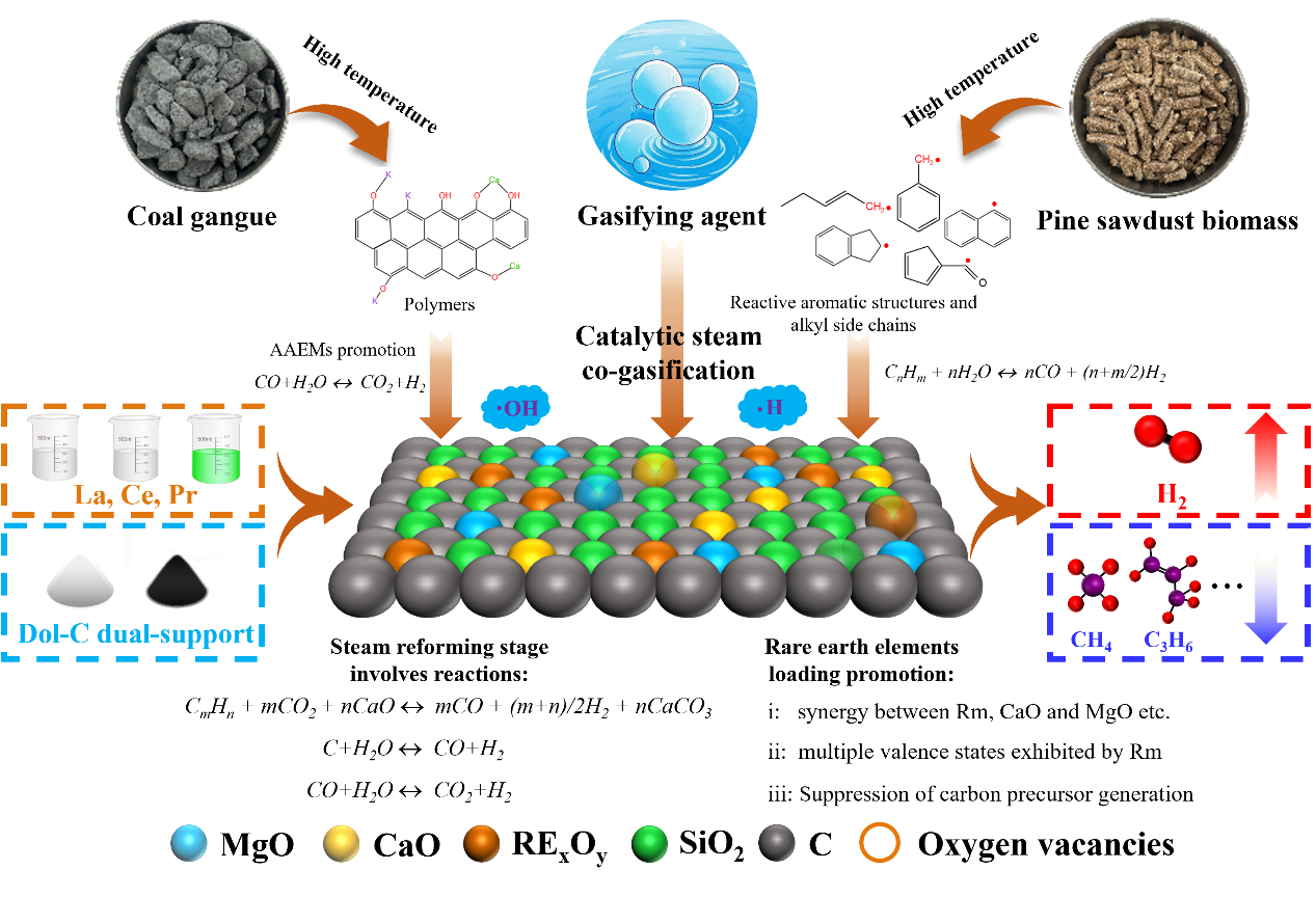 稀土元素素有“工业味精”之称,在催化与能源转化领域展现出非凡潜力。将生物质与煤矸石通过协同高效催化热化学转化为氢能(富氢燃气或化工合成原料气)并实现高值化综合利用,是一项重要的发展方向,极具发展潜力与应用前景。
